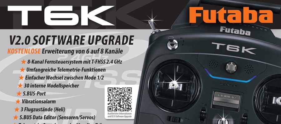 Gutes wird noch besser! Für die Futaba T6K ist ab sofort das kostenlose Software-Update v2.0 verfügbar. Damit wir die T6K auf eine echte Achtkanal Anlage erweitert. Außerdem unterstützt die Software die Telemetrie-Sensoren SBS-01C (Stromsensor) & SBS-01V (Spannungssensor) und es stehen MATRIX Flightmodes für Multikopter sowie eine Gasknüppel-Timer-Funktion mit variabler Laufgeschwindigkeit zur Verfügung.