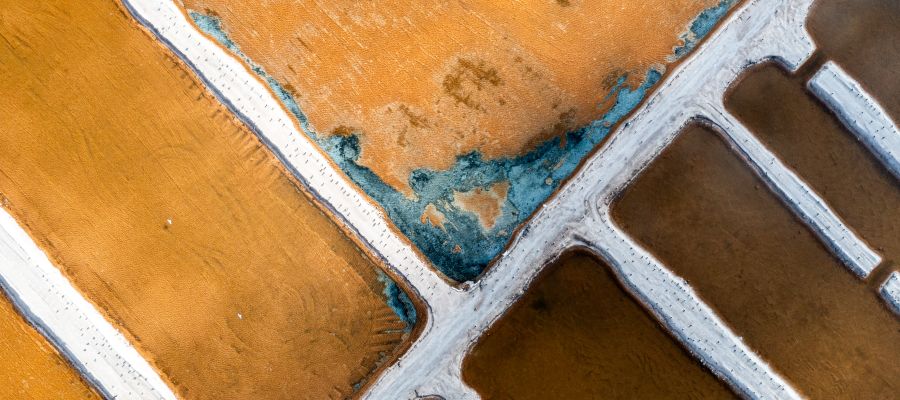 Eine ganz andere, aber nicht weniger beeindruckende Quelle abstrakter Strukturen sind Salzsalinen. Hier sind es nicht Naturkräfte allein, die das Bild bestimmen, sondern die Kombination aus künstlich geschaffenen Becken und natürlichen chemischen Prozessen. Durch unterschiedliche Salz- und Mineralienkonzentrationen bilden sich intensive Farben. Aus der Luft wirken diese Becken wie geometrisch angelegte Farbflächen, ordentlich getrennt durch geradlinige Begrenzungen. Das Ergebnis erinnert an moderne abstrakte Kunst, nur entstanden durch Verdunstung und Salzablagerungen.