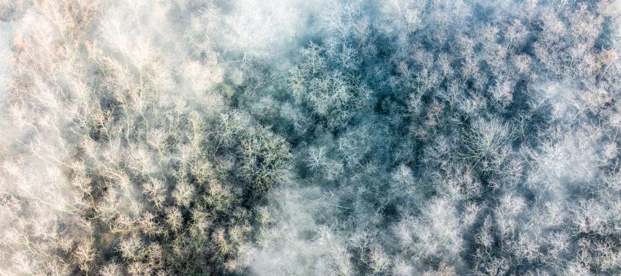 Nebelschwaden und Raureif über einem Waldgebiet