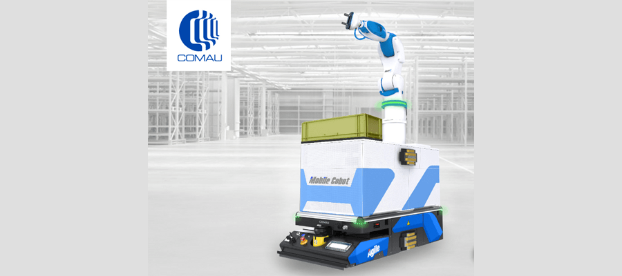 Comau’s mobile robotics paradigm integrates the company’s high-payload Racer-5 COBOT, a 6-axis articulated robotic arm that can work at industrial speeds of up to 6 m/s when human operators are not present, and its Agile1500 autonomous mobile vehicle. It supports customized and efficient operations where human operators and machines work side-by-side, and is designed to handle individualized production within an Industry 4.0-enabled manufacturing environment. It can also be seamlessly integrated within Comau’s digital infrastructure, further safeguarding productivity and profitability across the entire manufacturing line. Visual feedback for pick and place operations, as well as other tasks, is provided thanks to an integrated vision system, such as the novel Comau MI.RA, installed directly on the arm. Finally, the robotic arm is mounted on an autonomous mobile platform equipped with two independent batteries that power the AGV and the robotic arm separately and can be managed using different types of navigation modes and a standard Comau controller.