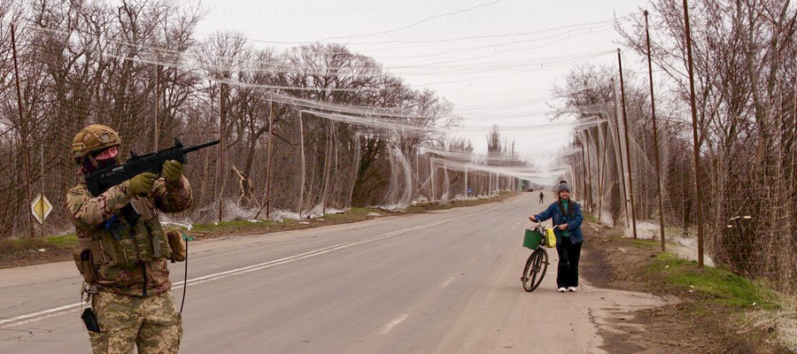 Nur noch wenige Zivilisten sind in den oft in großen Teilen zerstörten Dörfern geblieben. Die Frau stoppt mit ihrem Rad, während der Soldat auf eine Drohne zielt